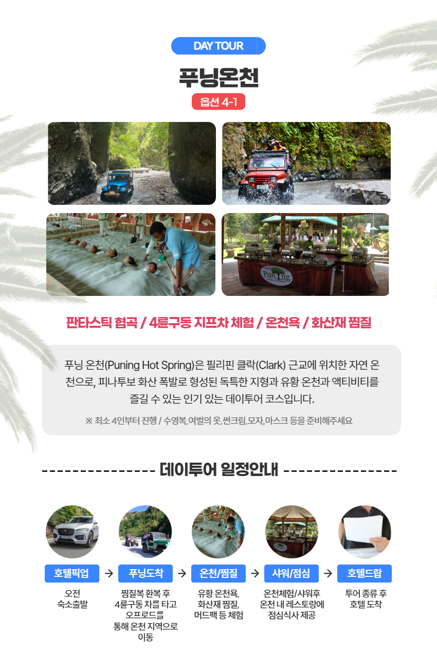 푸닝온천은 필리핀 클락 근교에 위치한 자연 온천으로 , 피나투보 화산 폭발로 독특한 지형과 유황 온천과 엑티비티를 즐길 수 있는 인기있는 데이투어 코스입니다.